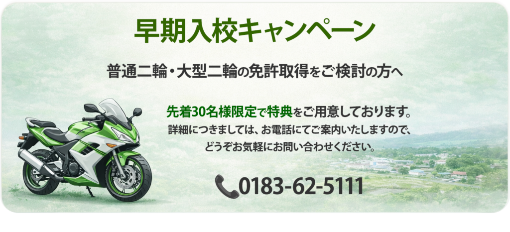 羽後自動車学校 免許取得を安全・安心サポート UGO Driving School 入校手続き案内 お知らせ 当校指導員は強い日差し対策としてサングラスを着用し、教習を実施している場合がございます。 ご理解くださいますようお願い申し上げます。 羽後自動車学校で取得可能な免許 経験豊富なスタッフが親切丁寧な指導の元、安心して受講できる環境づくりを心がけています。個々それぞれのライフスタイルにも合わせて通いやすい学校です。 普通二輪車 大型二輪車 大型特殊自動車1 大型特殊自動車2 普通自動車 準中型自動車 中型自動車 大型自動車 牽引自動車 普通二種 学びやすい環境づくりでサポートします 秋田県羽後町にある羽後自動車学校では学びやすい環境づくりとライフスタイルに合わせた一人ひとりに合ったペースで卒業までサポートいたします。 第一教室 第二教室 応急救護室 効果測定パソコン 自習スペース 〒012-1126 秋田県雄勝郡羽後町杉宮字柏原10-2 0183-62-5111 0183-62-5110 0120-025537